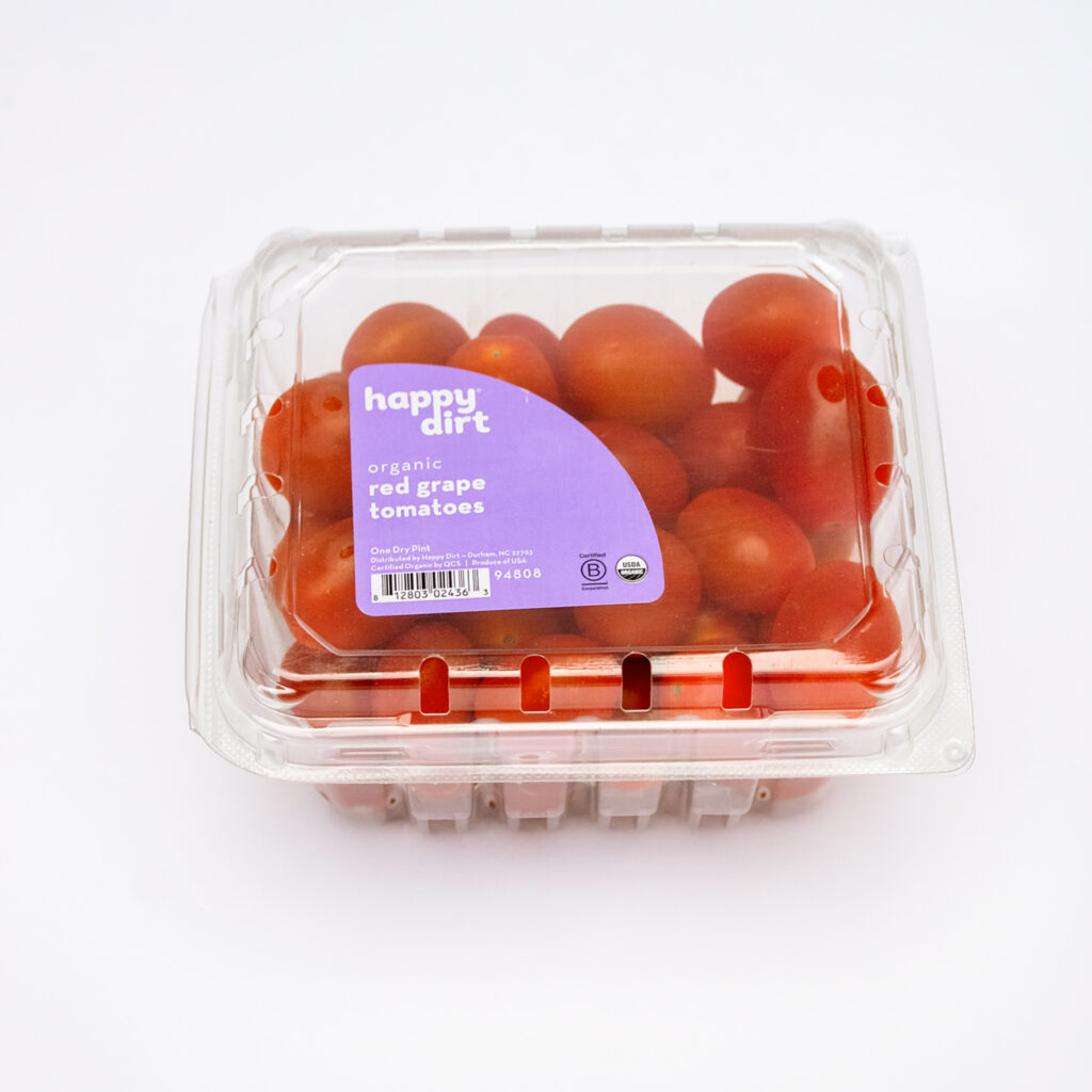 clamshell pint filled with organic mixed cherry tomatoes on a white surface